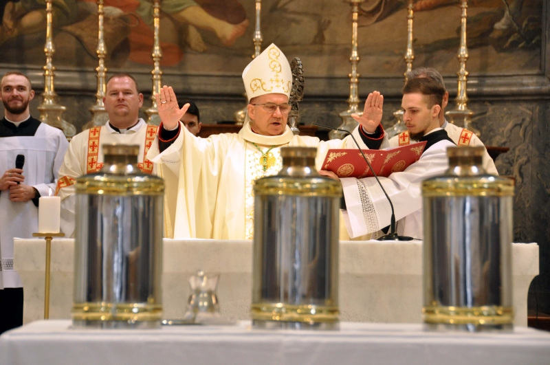 Homíliája végén szólt a diakónusokhoz, akiket a papok segítőtársainak nevezett a pásztori szolgálatban, illetve a világi Krisztus-hívőkhöz is, akik a keresztség révén az általános papság részesei. Ezt követően a papok megújították a szenteléskor Istennek tett ígéretüket. A szentmise során sor került a keresztelendők (katekumenek) és a betegek olajának, valamint a – keresztség, bérmálás, egyházi rend kiszolgáltatásakor, illetve templomszenteléskor használatos – krizma megszentelésére. A szertartás végén a püspök köszöntötte a jubiláló papokat; az ezüstmisés Csiba Tibor, Hugyecz János és Rolik Róbert atyákat, az aranymisés Turai János atyát, a szentelésük 55. évfordulóját ünneplő Kárpáti Sándor és Vagyóczky József atyákat, illetve a gyémántmisés Hupka József atyát.