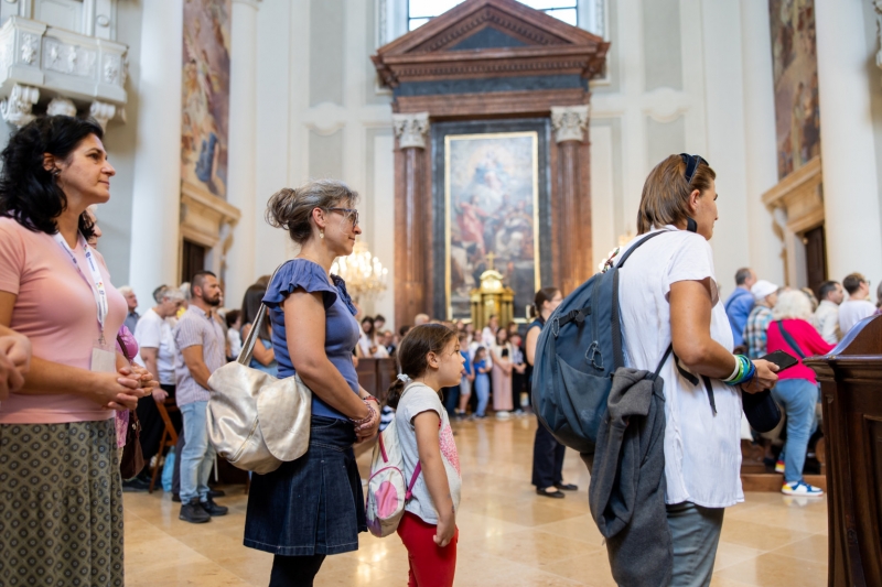 Két közösen megélt eseményre hívta Zalán atya a részvevőket: délben a jubileumi zarándoknap ünnepi szentmiséjére, a tavaly ősszel, Marton Zsolt váci megyéspüspök által, a felújítást követően megáldott Nagyboldogasszony Székesegyházba, majd a napunk zárásaként a 18:30 órakor kezdődött Misztrál együttes koncertjére.