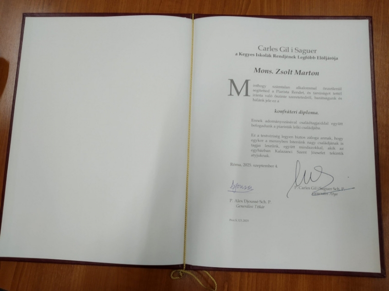 A nagyszabású terv megvalósításáért hálás szívvel és emléklapok átadásával köszönetét fejezte ki Ivony István igazgató úr és Vass Bálint pasztorális vezető. Végül Zsódi Viktor piarista tartományfőnök köszönete jeléül Marton Zsolt püspök atyának Carles Gil i Sauger generális atya által Rómában kiállított konfráteri diplomát nyújtott át, amely a rendhez fűződő kapcsolat különleges elismerése.