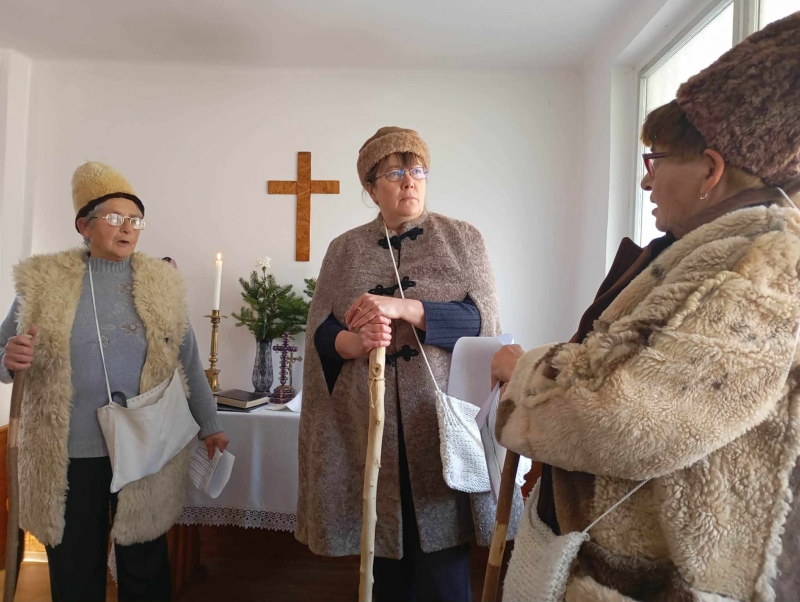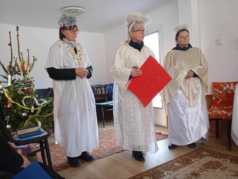 Karácsonyi szolgálatunk másnap a helyi evangélikus imaházban folytatódott annak apropóján, hogy közösségünk egyik tagja evangélikus vallású, a helyi közösség gondnoka. Szeretettel tettünk eleget a megtisztelő meghívásnak. A gyülekezetet Horváth-Hegyi Ádám salgótarjáni lelkész vezeti, aki nagy megtiszteltetésben részesítette színjátszó közösségünket: istentisztelet keretében adtuk elő a karácsonyi szolgálatunkat. A kis imaház meghitt légköre, a jelenlévők folyamatos figyelme megerősített bennünket. Természetes, hogy ott maradtunk evangélikus testvéreink között az istentisztelet további részében is. A fiatal lelkész megkereste a közös énekeket, amelyeket mindannyian ismertünk. Az istentisztelet után szeretet-vendégség következett. Megköszöntük a megtisztelő meghívást, a kölcsönös egymásra figyelést, az ökumenikus szemlélet kézzel fogható megvalósulását. Elmondhatjuk, hogy egy különleges délutánt töltöttünk el együtt. Legyen máskor is részünk hasonló lelket melengető élményben!