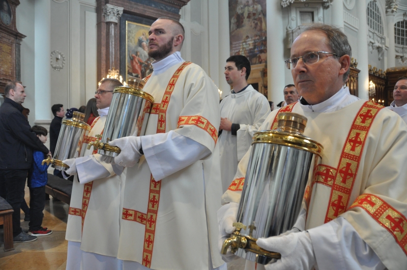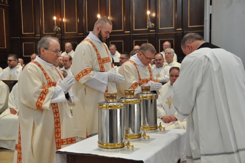 Ezt követően hozták be a szentelésre váró olajokat a diakónusok, amelyek közül a felajánlás közben a megyéspüspök megáldotta a betegek olaját, majd a záróáldás előtt a katekumenek olaját és a krizmát.