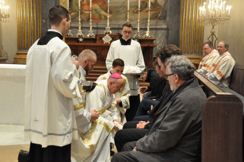 A szentbeszédet követően a főpásztor megmosta 12, a közösséghez tartozó és erre előzetesen kiválasztott férfi lábát.