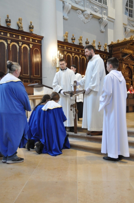 Az igeliturgia után háromszor hangzott fel a templomban: „Íme a szent keresztfa, rajta függött valaha a világnak váltsága!” Majd Krisztus keresztje egyre beljebb haladt a templomhajón át a szentélybe. A hívek a kereszt elé járulva térdhajtással fejezték ki tiszteletüket a megfeszített Krisztus előtt.