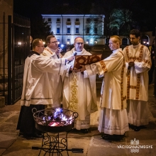 Vácon a szertartás este fél kilenckor kezdődött – az erős szél miatt ezúttal a székesegyház porticusában - a tűz szentelésével. Erről a megszentelt tűzről gyújtották meg a húsvéti gyertyát, majd erről a Krisztust jelképező gyertyáról terjedt tovább a fény a hívek kezében lévő gyertyák segítségével mindenhol a templomban ezzel is üzenve: a fény, Jézus velünk van újra. Az „Exultet”, azaz húsvéti örömének az egyház egyik legszebb himnusza, amely megénekli a szabadítást, Krisztus feltámadását és örökké tartó dicsőségét.