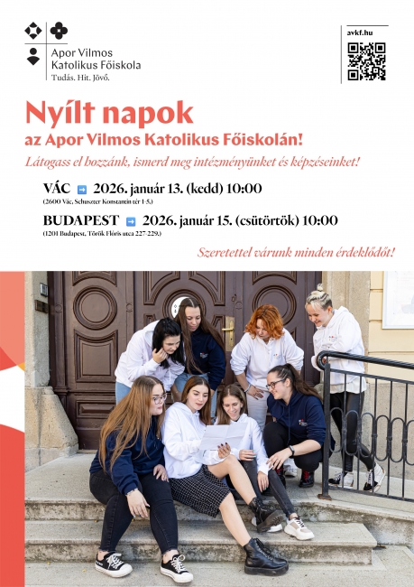 Az Apor Vilmos Katolikus Főiskola nyílt napokat hirdet Vácon 2026. január 13-án, kedden 10 órától és Budapesten 2026. január 15-én, csütörtökön 10 órától, ahová szeretettel meghívja az érdeklődő fiatalokat.