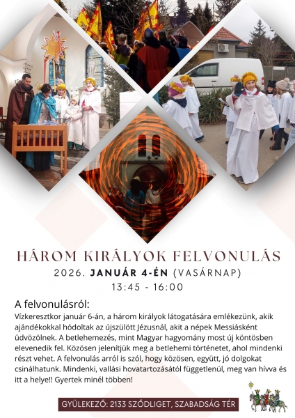 Vízkeresztkor a három királyok látogatását elevenítik fel Sződligeten a római katolikus egyházközség szervezésében. Mindenkit szeretettel várnak!Időpontja: 2026. január 4. (vasárnap), 13.45 óra