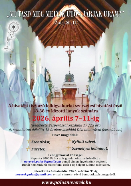 Lelkigyakorlat költsége: Naponta 3000 Ft. Ha ez is gondot okozna érdeklődj a következő e-mail címen. Igyekszünk segíteni: noverek.palos@gmail.com