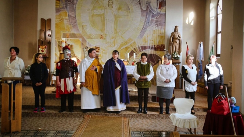 A Szent László Közösség szervezésében és előadásában március 29-én, virágvasárnap délután 17.30-kor szabadtéri passió lesz látható a ságújfalui faluközpontban és templomkertben.A fotón a 2022. évi modern passió, a Pilátus pere című előadás csoportképe látható.